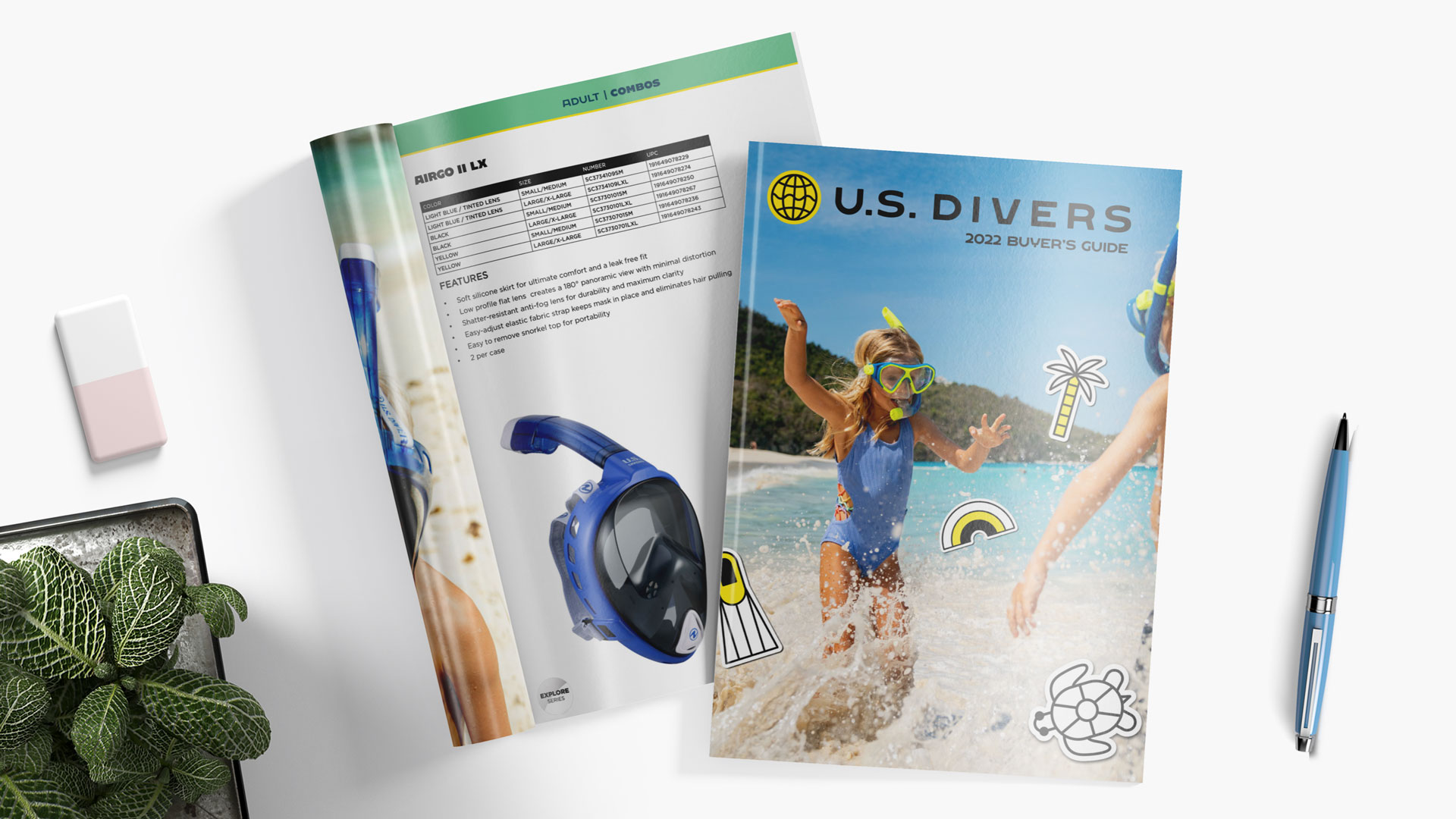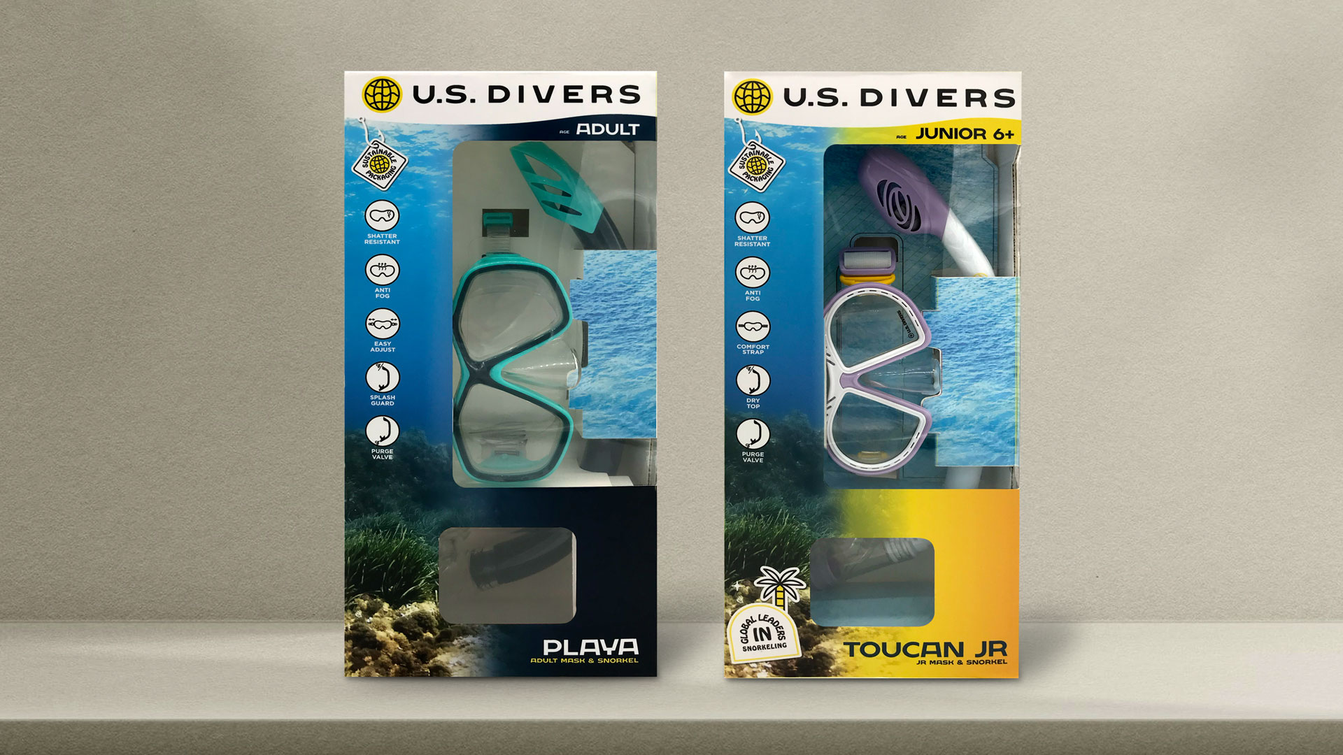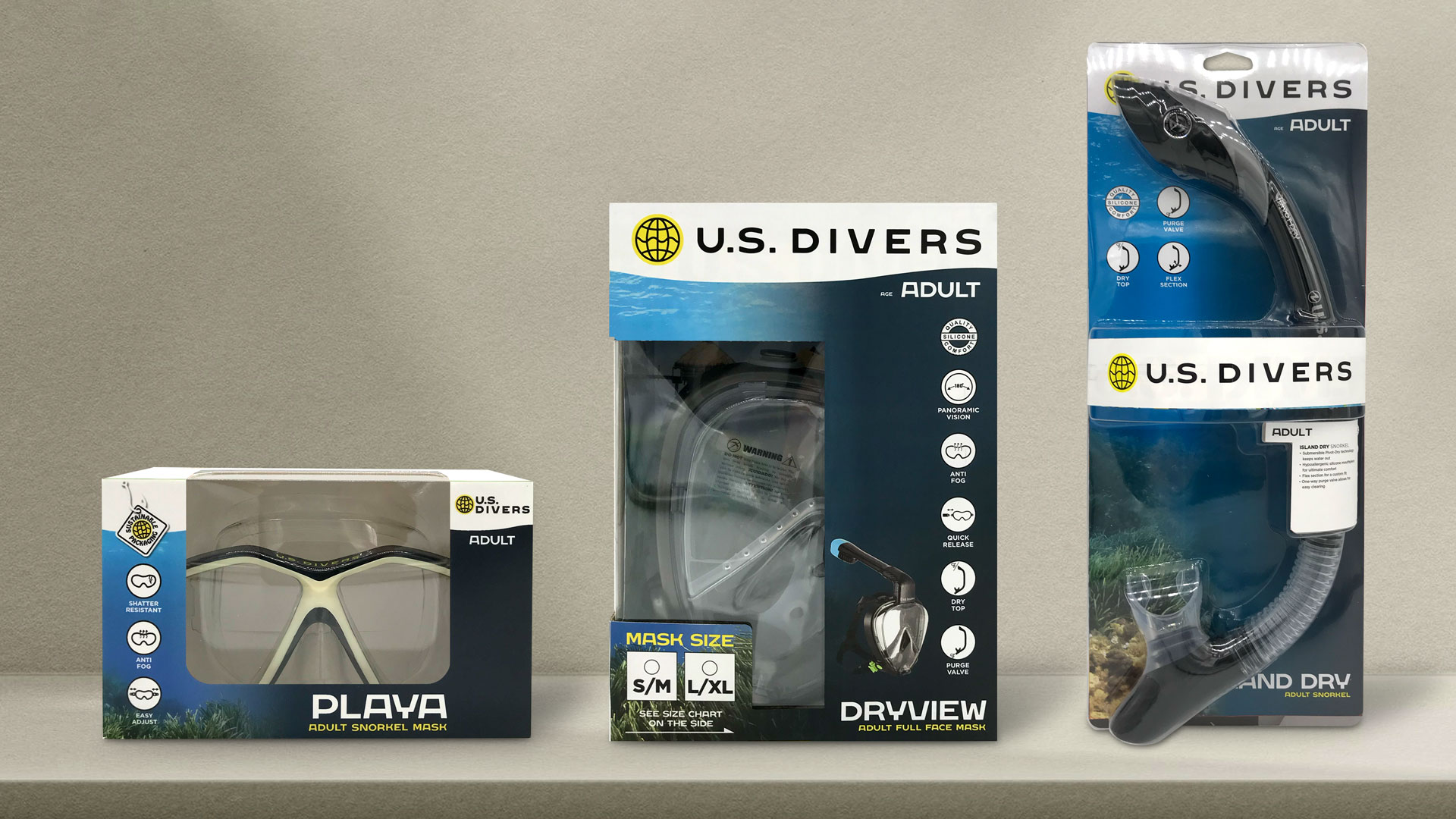 US Divers is a snorkeling brand. I designed the branding which includes logo, packaging, brand identity, product booklet, website, and social media. I also created product images, feature and benefits for Amazon and Walmart online stores.